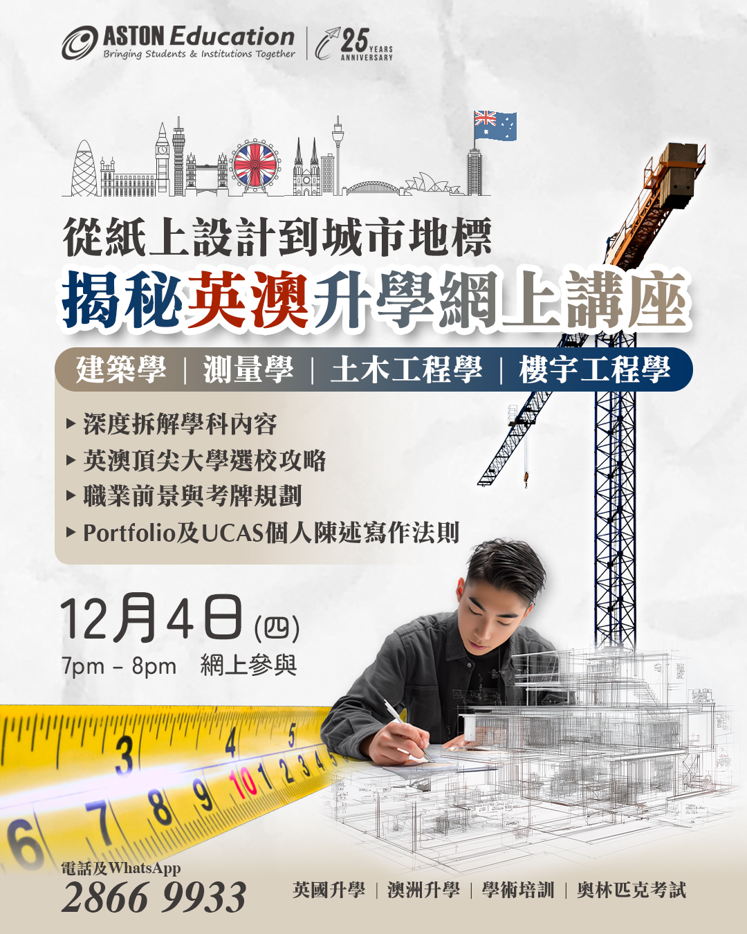 講座上,Aston Education資深教育顧問將於講解相關學科的選校策略、收生要求、兩地申請攻略、作品集(Portfolio)及個人陳述(Personal Statement)寫作技巧法則*、作品集準備、面試要點,以及申請的重要日期等實戰建議。