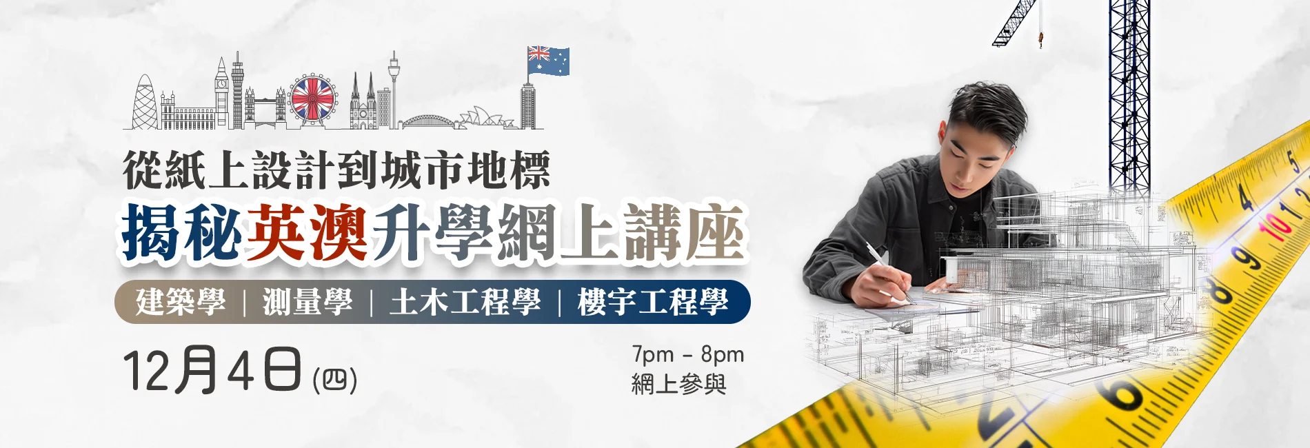 全球基建項目正值高峰黃金期!世界各地機場、地鐵鐵路、高樓大樓、城市翻新項目,建築及工程相關行業正面臨「嚴重人才荒」,未來近十年最搶手的行業選擇之一!範疇涉及建築學、樓宇工程學、測量學、土木工程學,這4門學科看似相近、實則大不同的「高薪學科」。香港只有少數大學提供相關學位課程,且收生門檻高,競爭較大,對比起英國或澳洲的大學及課程選擇將會更多。