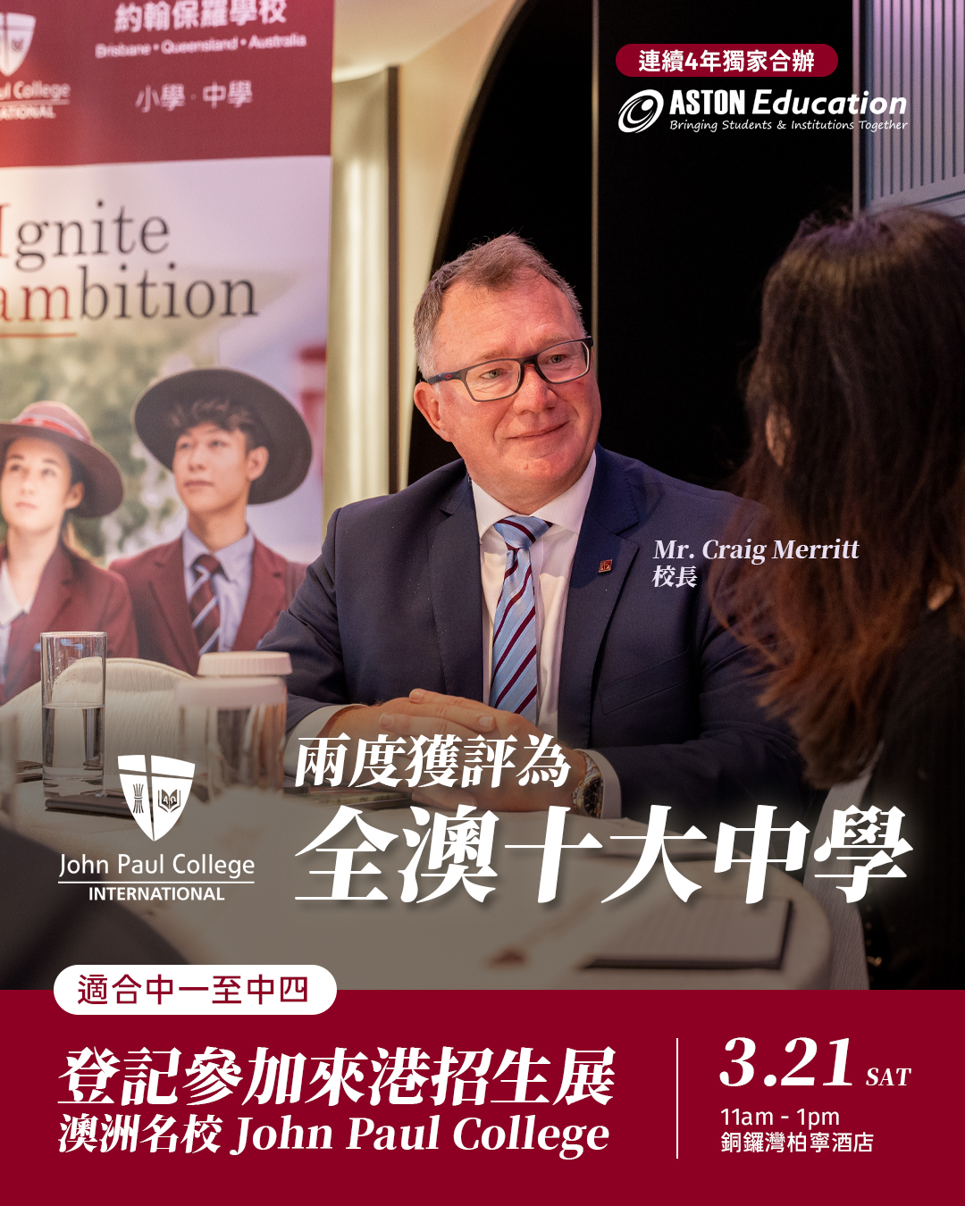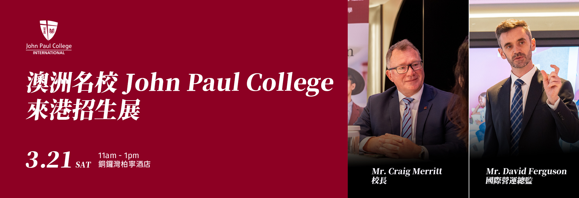 澳洲寄宿中小學 John Paul College 已第4年在港舉行招生展,每年均吸引眾多家長及學生親臨,深入了解學校教學方針、課程內容及國際學生支援服務。除了與校長及學校代表直接會面交流,您還可聽取校長分享未來發展計劃,評估學習環境是否符合您及子女的期望。