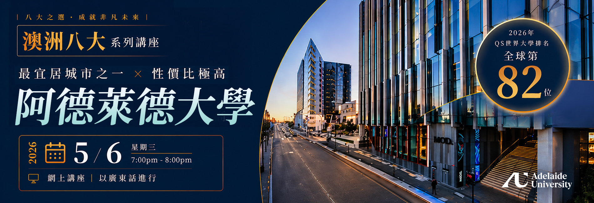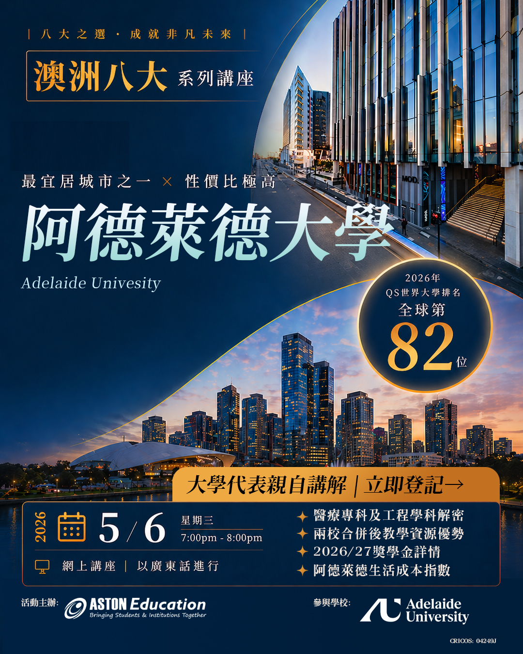 這所匯聚兩校龐大資源的「超級大學」,DSE 最佳五科 16 分已符合基本入學要求。以更易負擔的生活成本,換取全球百強的八大學歷,這項「學術投資」的回報率,絕對值得認真考量。想全面掌握這所全新頂尖大學的最新收生要求及熱門學科資訊?Aston Education 誠邀 Adelaide University 官方院校代表親臨解說,助你及早制定清晰的升學策略!