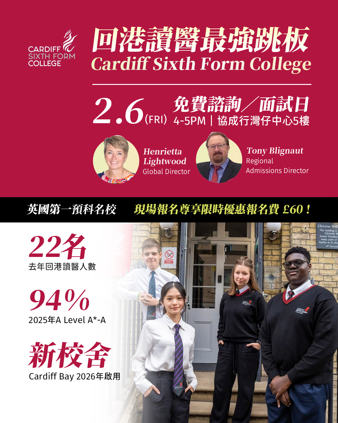 Cardiff Sixth Form College 連續十多年穩居全英 A-Level 成績表榜首,被公認為全英學術成績最頂尖的預科學校之一。A Level A*-A 每年穩取90%或以上,與一般英國寄宿學校拉開明顯差距,對衝刺頂級大學的學生尤其具優勢。學校過往多年成功培養大批學生晉身牛津、劍橋、帝國理工等頂尖學府,熱門學科包括醫科、工程、法律及自然科學等高競爭課程,對以「世界 Top 10 大學及高門檻學科」為目標的香港學生而言,是極具針對性的升學跳板。