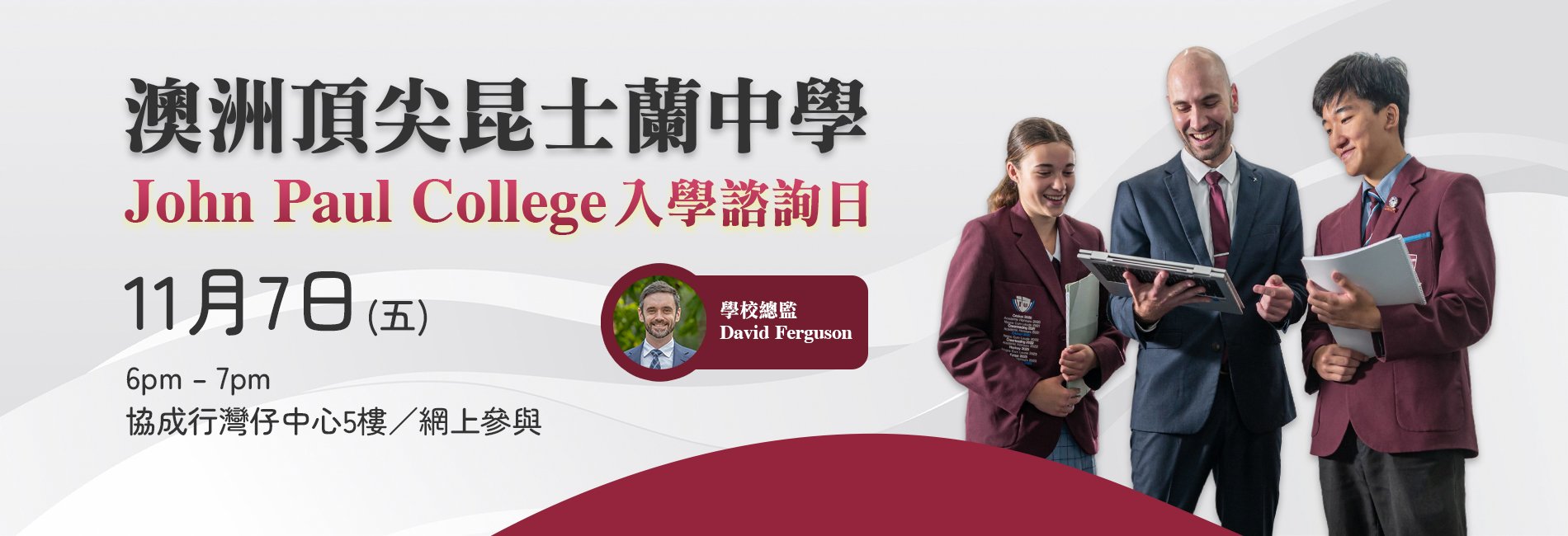 John Paul College 位於澳洲昆士蘭,是備受國際家長及學生推崇的精英中學。過去三年連續來港舉辦招生展,每年吸引逾百名學生及家長到場認識。如果您正尋覓一所學術卓越、課外活動多元化的頂尖中學,John Paul College 絕對值得列入您的首選名單!