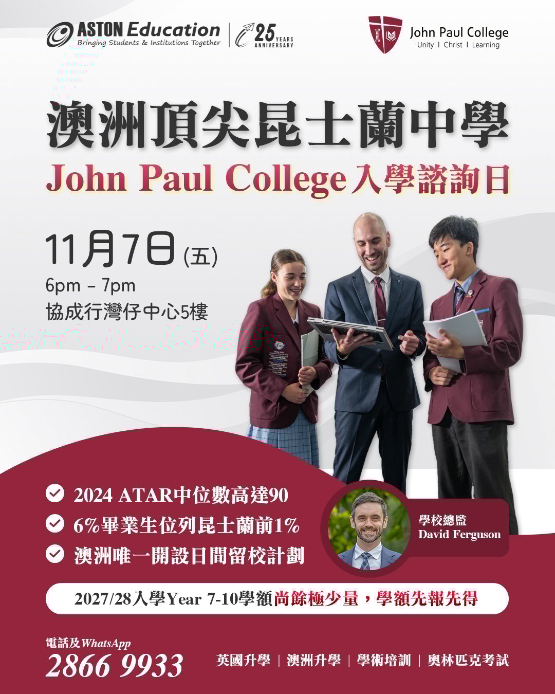 David Ferguson 校長將親臨 Aston Education,與有意申請的學生進行一對一面談。如有興趣參與面談或想深入了解學校請填寫以下資料登記,可選擇親臨會面或網上參與。