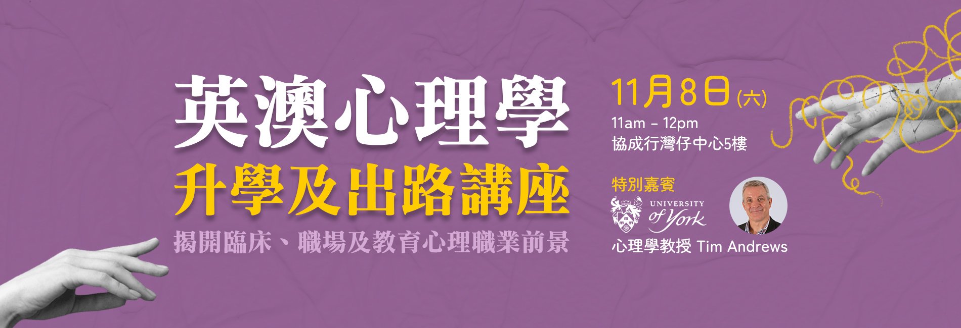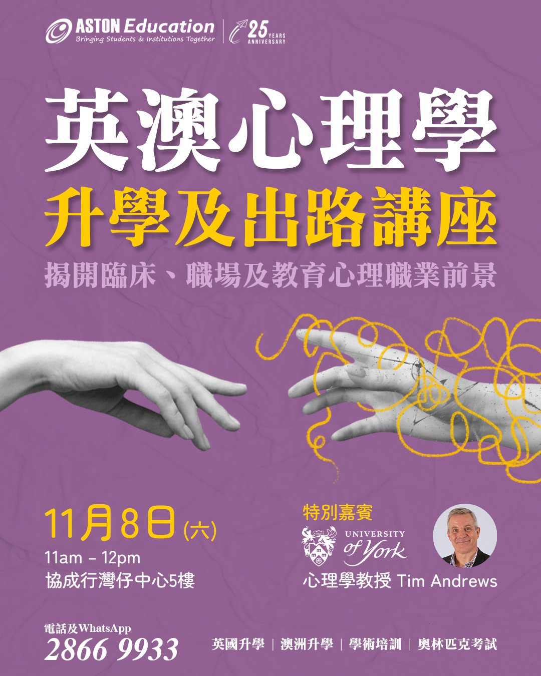Aston Education 英澳升學中心將帶您揭開心理學畢業後的多元出路——從臨床心理學家、教育心理專家,到職場心理顧問、輔導及社會工作者等領域,一次過讓您看清方向!修讀心理學可開啟多個行業分支,但每個分支通常需修讀相關碩士課程,講座上教育顧問將為你逐一講解心理學及相關前景職業所需修讀的學士及碩士課程,當中包括在英國及澳洲的修讀選擇。講座更邀請英國 University of York 心理學講師,深入講解心理學學士修讀內容,並剖析在 University of York 修讀的優勢。同時,Aston Education 教育顧問將提供心理學相關選校建議分析,助您揀出最合適的大學選擇。立即登記講座,現場更可預約 Aston Education 升學顧問一對一諮詢,精準規劃您的心理學之路。若透過 Aston Education 申請英國大學,可豁免 UCAS 報名費;申請澳洲大學更有機會豁免部分大學申請費!