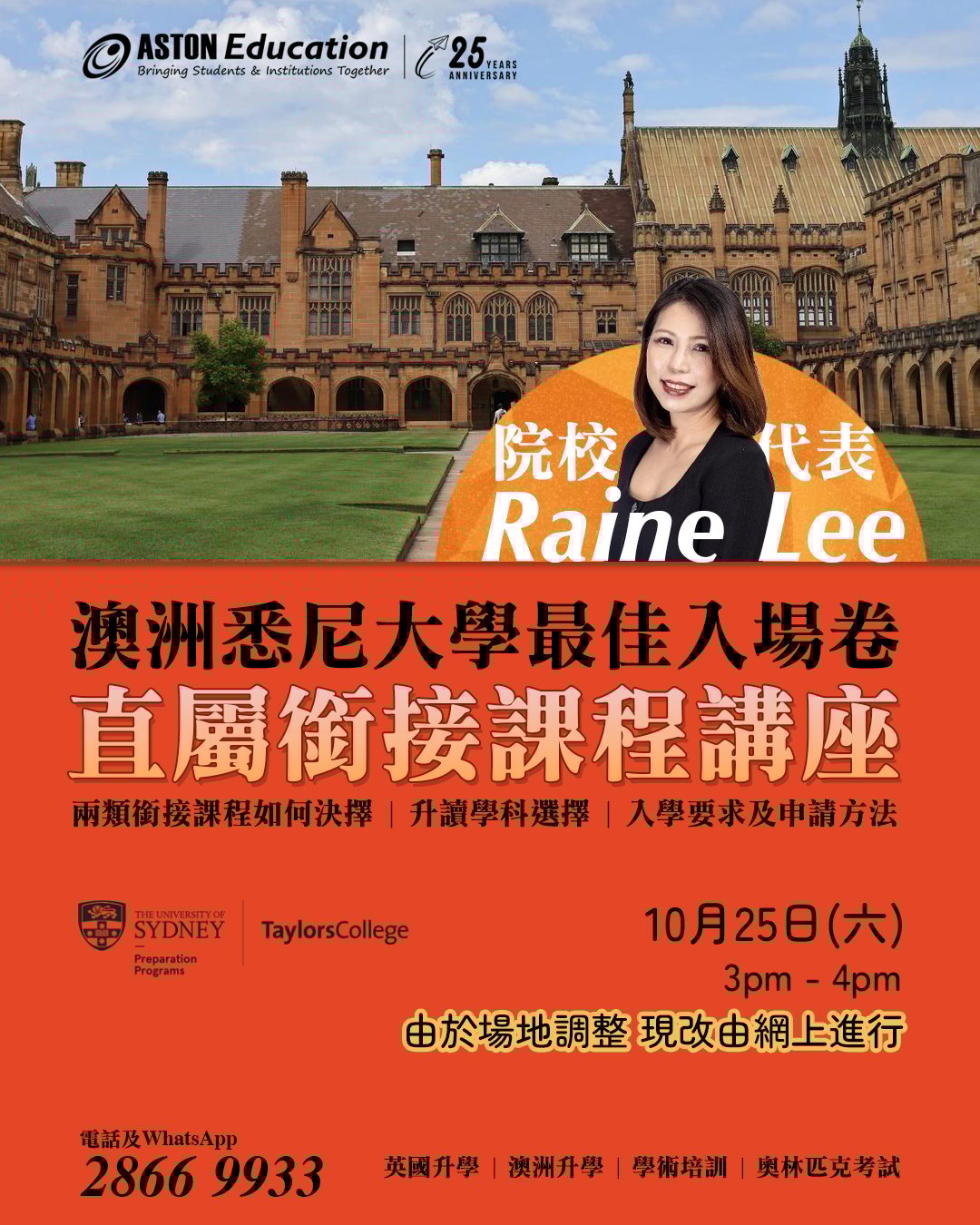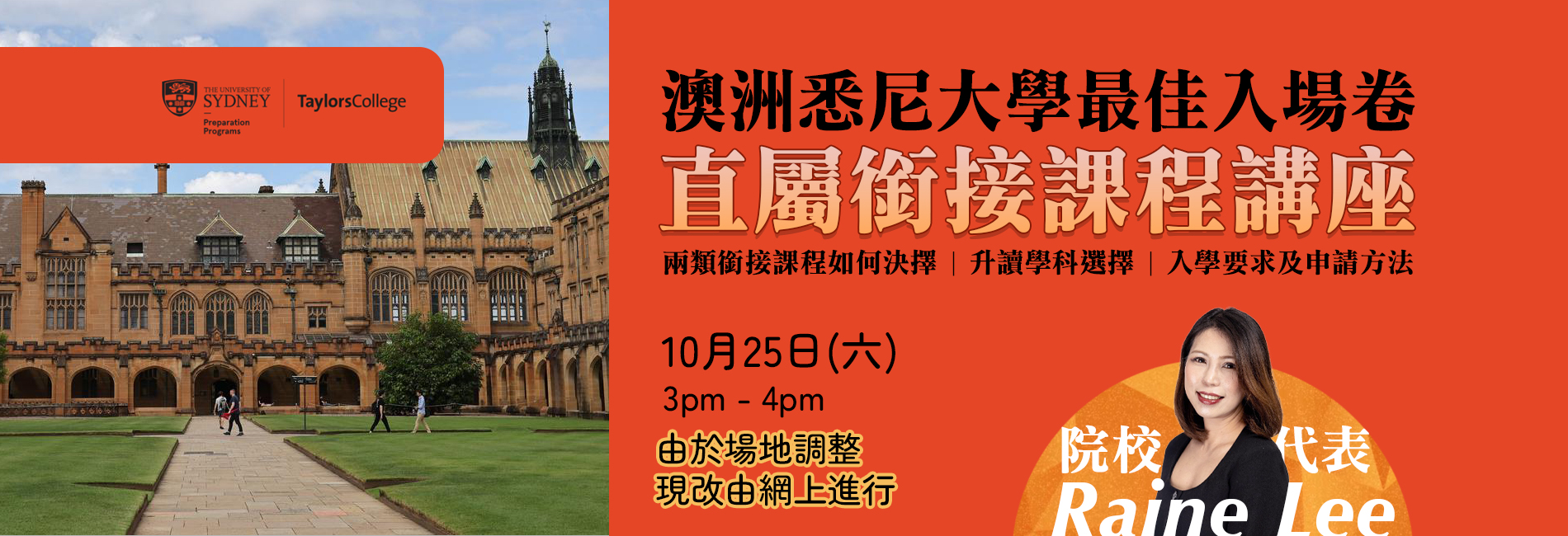 為了讓您更深入了解課程,Taylors College Sydney的院校代表將剖析課程優勢、入學要求及相關入學重要資訊,包括詳細的申請流程、課程費用及住宿安排。