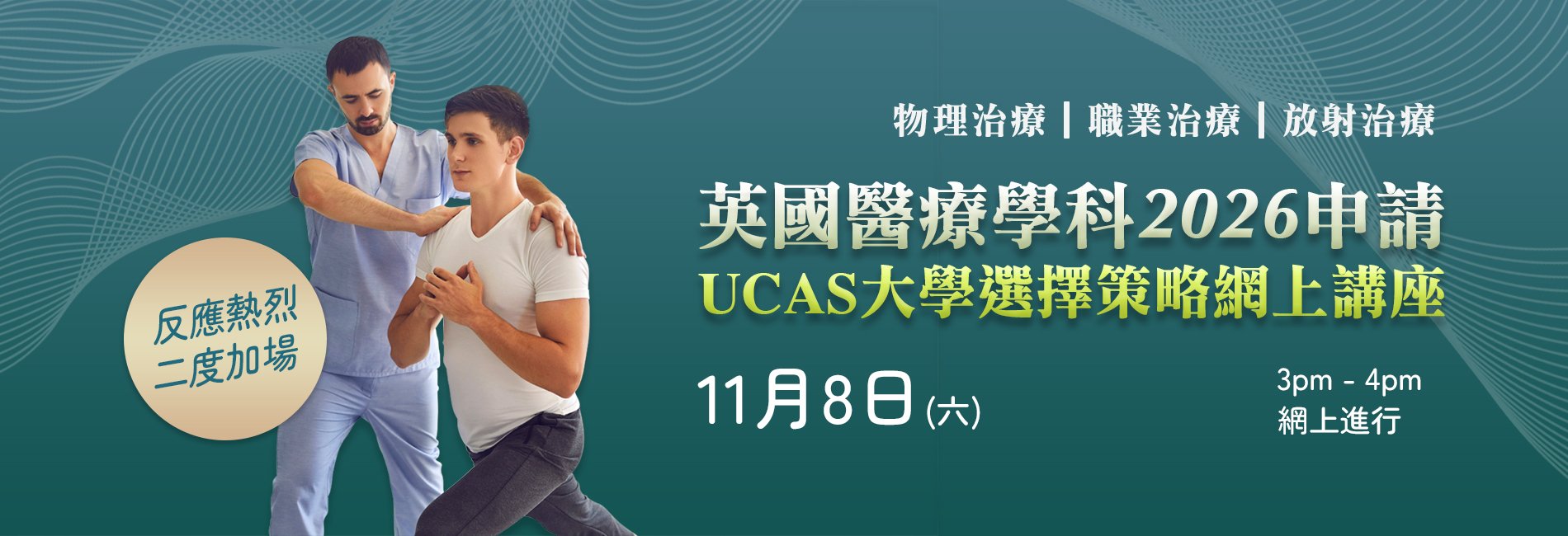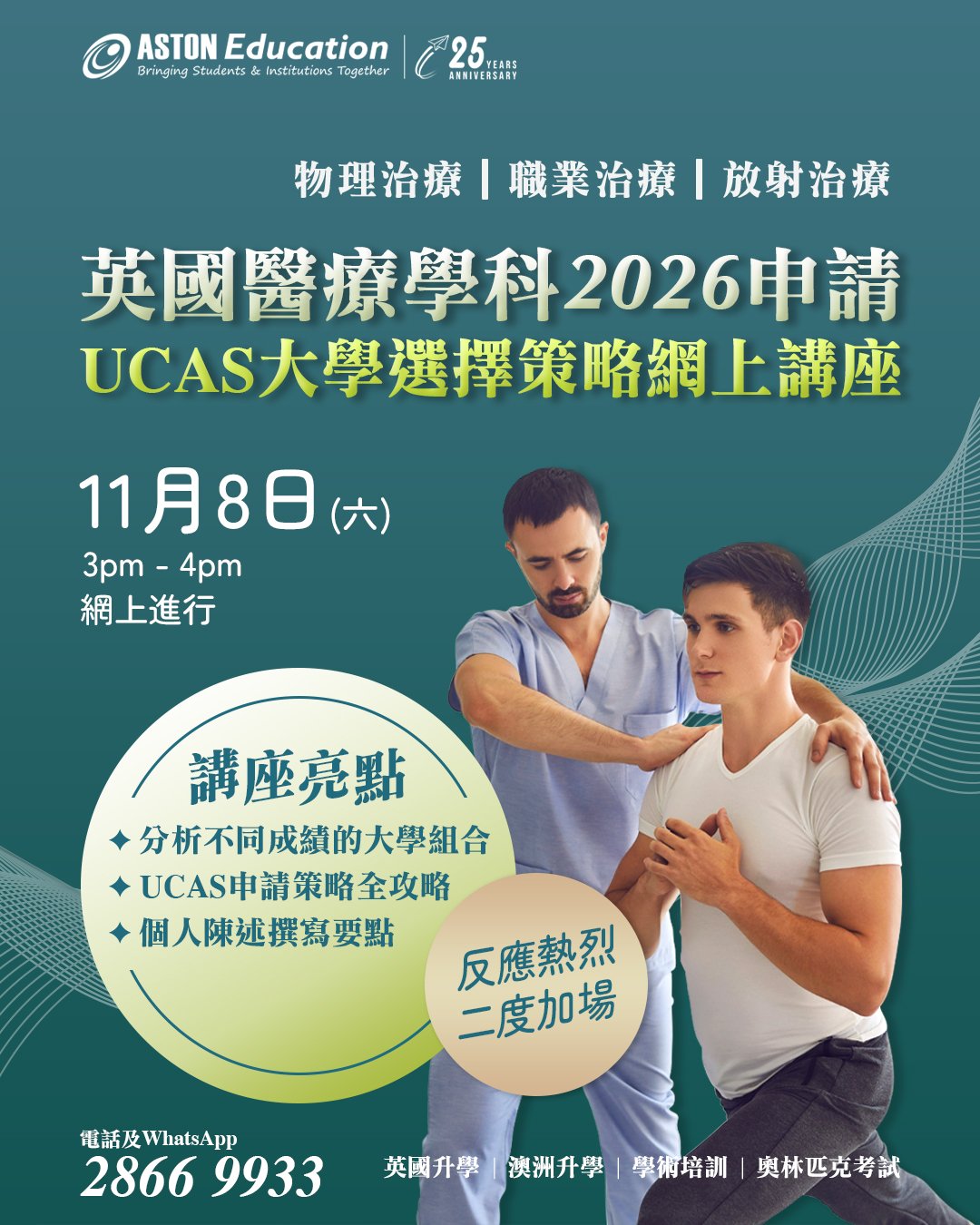 英國的物理治療、職業治療及放射治療向來深受香港學生歡迎,2026年申請亦已展開,英國聯招系統UCAS僅允許申請5間大學,如何策略性分配這些寶貴名額成為成功入學的關鍵!本講座由Aston Education教育顧問主講,將根據學生預估成績,為您剖析英國醫療學科的申請黃金策略與5間大學選擇組合!講座二度加開講座場次,立即登記!