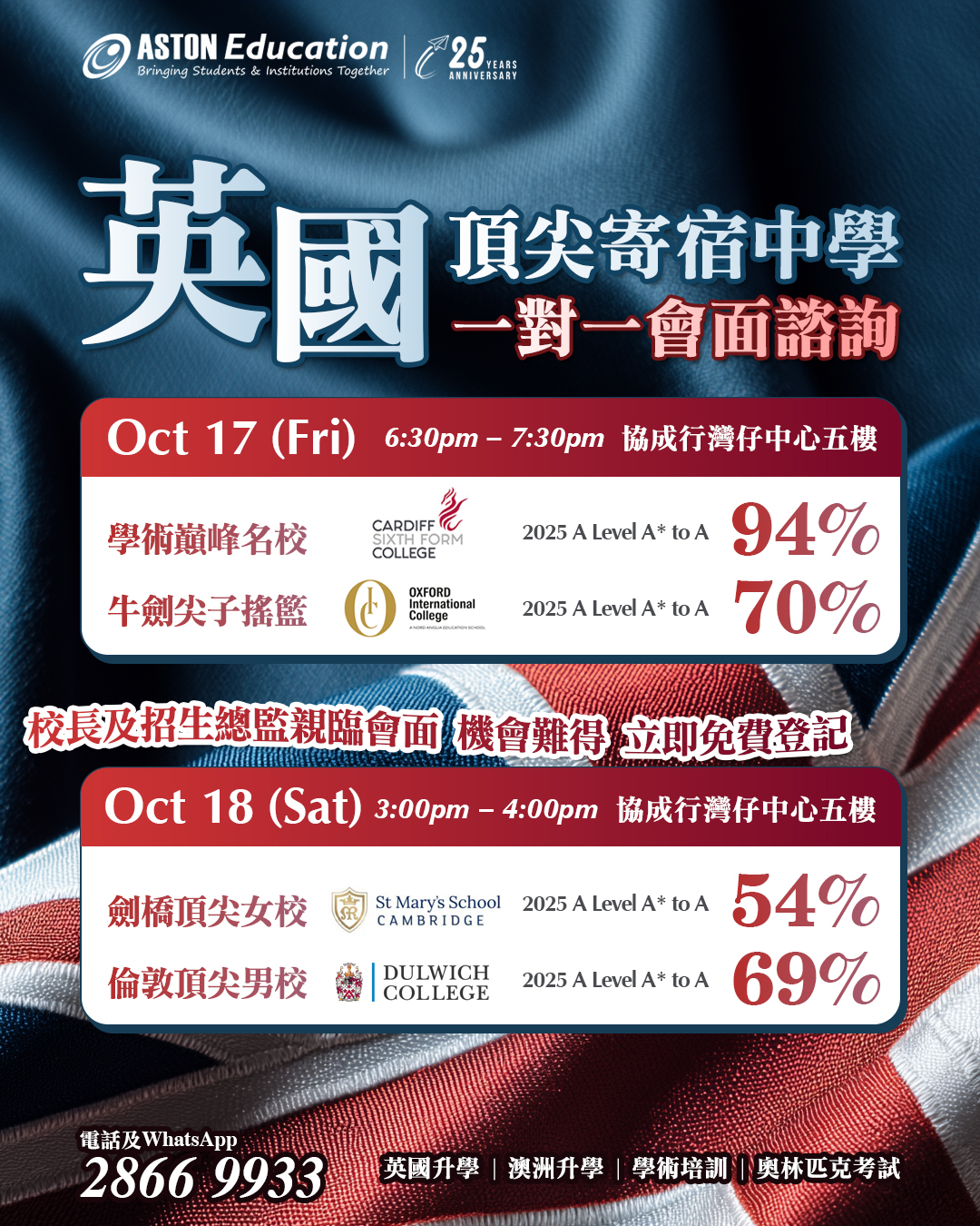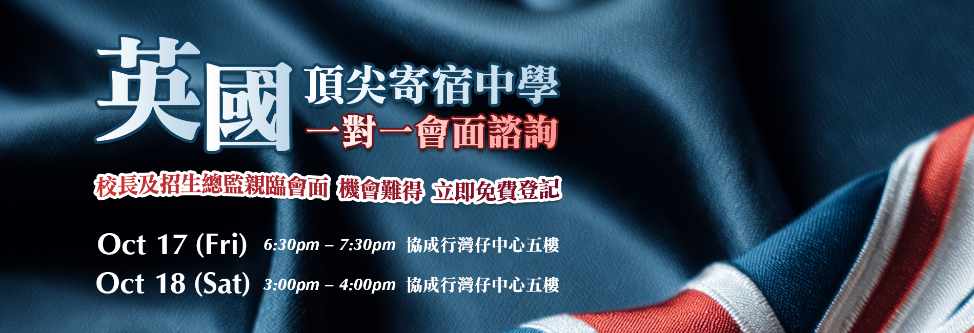 4間英國頂尖中學 Oxford International College、Cardiff Sixth Form、Dulwich College及St Mary’s School Cambridge的校長及招生總監將親臨本中心與你會面。是次活動提供免費一對一諮詢,每場會面約15分鐘,並可於現場進行報名。 預約時段非常有限,立即把握機會報名!