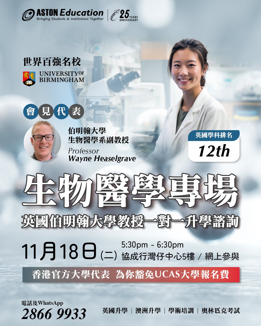伯明翰大學生物醫學系副教授,擁有24年的專業經驗,專精眼科疾病研究與藥理學教學,他將親自與你分享第一手升學與職業發展資訊。